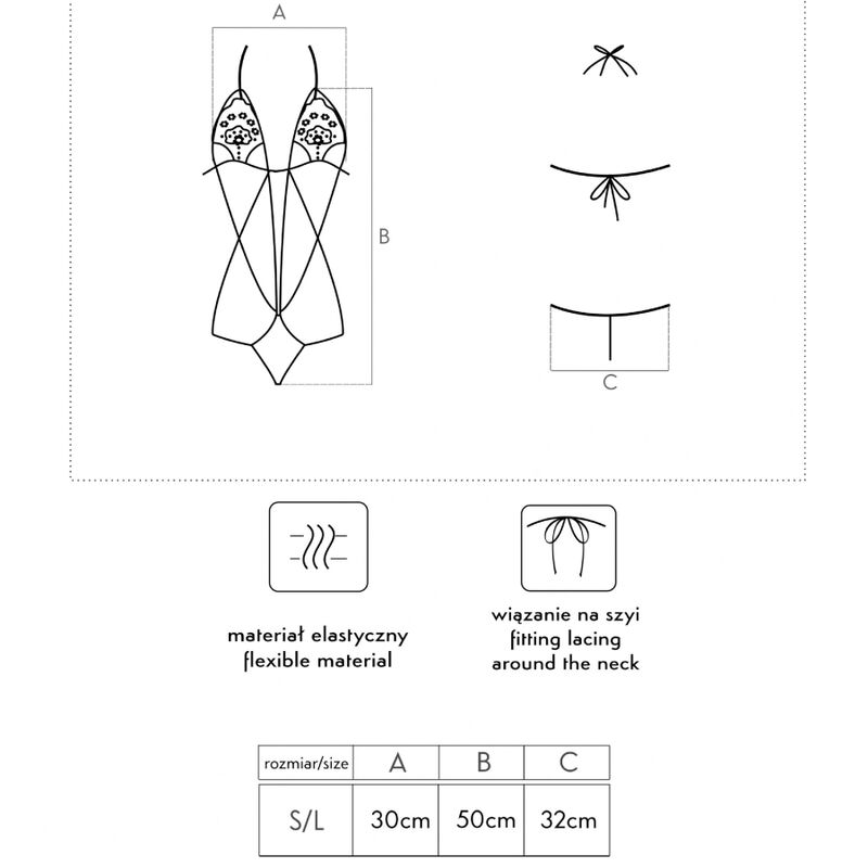 Un body diminuto y sensual encenderá tu imaginación y convertirá la noche en una experiencia inolvidable. El body Luisina consta de un delicado sujetador de encaje y un tanga con un encantador motivo de rosas. El tanga y el sujetador están conectados con una maraña de tirantes que enfatiza la cintura y las curvas femeninas. Un sujetador que revela parcialmente los pechos mientras los levanta ligeramente agrega un toque increíble a todo el look. Los tirantes ingeniosamente dispuestos que fluyen hacia abajo entre los pechos hasta el tanga estilizan ópticamente la figura. Las caderas y los hombros prácticamente expuestos, así como la espalda y los glúteos, que están decorados solo con un tirante de tanga y dos tiras, lo convierten en una propuesta atrevida para ella.